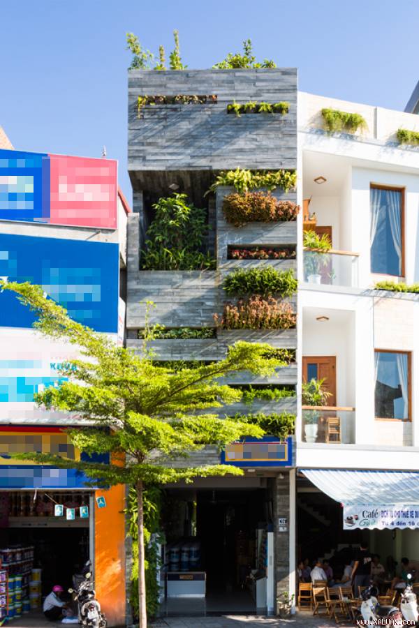 Đi trên tuyến đường đông đúc ở quận Thanh Khê (Đà Nẵng), nhiều người sẽ bị thu hút bởi công trình nhà ở 4 tầng có mặt tiền phủ đầy cây xanh. Những bồn hoa ốp tấm bê tông xếp chồng sát nhau mọc kín cây xanh, giúp giảm bụi, tiếng ồn.